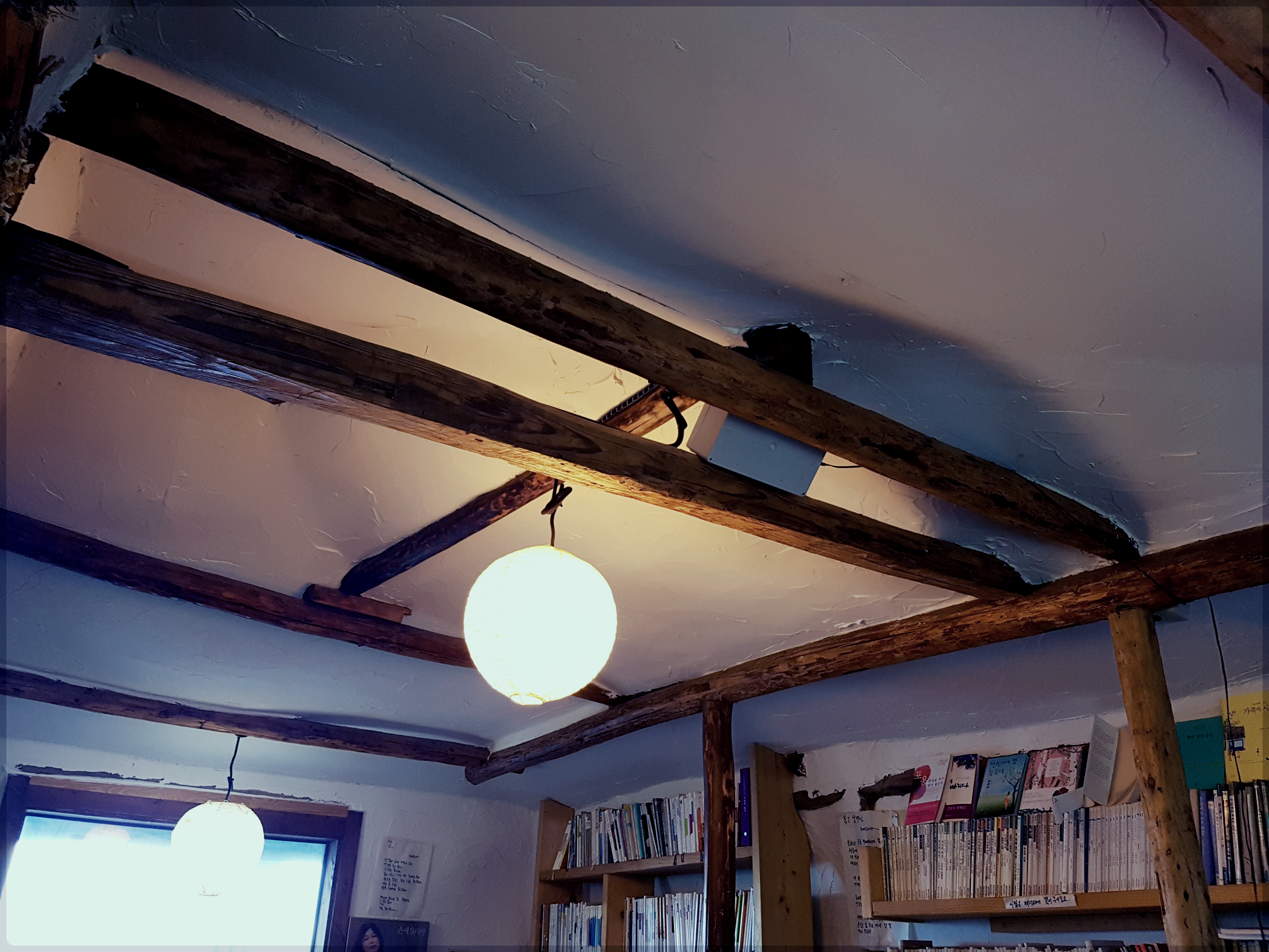 허름한 나무기둥, 회칠한 실내, 종이 등